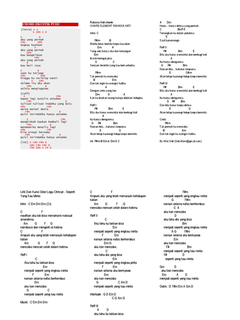 Berikut lirik dan chord lagu Puisi. E B aku yang pernah Cm Gm engkau kuatkan A aku yang pernah Gm kau bangkitkan Fm aku yang pernah B kau beri rasa. OTHER CHORDS YOULL LIKE.