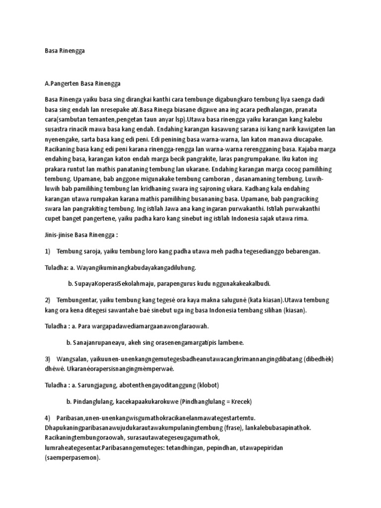 Salah satunya adalah tembung rinengga atau basa rinengga ini. Basa rinengga apa kang tinemu ing geguritan - Indonesia. Basa Rinega biasane digawe ana ing acara pedhalangan p r anata cara sambutan temanten peng e tan taun anyar lsp.